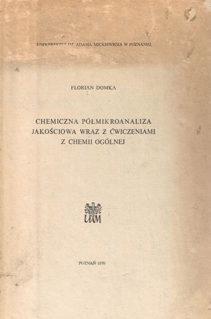 Chemiczna półmikroanaliza jakościowa wraz z ćwiczeniami z chemii ogólnej / Florian Domka. - Poznań : Uniwersytet im. Adama Mickiewicza, 1970. - VII, [1], 170, [1] strona, [8] kart tablic zlożonych : ilustracje ; 31 cm.