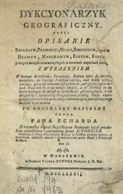 Dykcyonarzyk Geograficzny Czyli Opisanie Krolestw, Prowincyi, Miast, Biskupstw, Xięstw, Hrabstw, Margrabstw, Portow, Fortec y innych mieysc znacznieyszych w czterech częściach świata [...]. T. 2 / po angielsku napisany Przez Pana Echarda ; [tł. Fr. Siarczyński]. - Z trzynastey Edycyi Angielskiey na Francuzki ięzyk przełożony powiększony i poprawiony przez K. Vosgien, Nakoniec z osmey Francuzkiey Edycyi w Polskim wydany ięzyku, z dodatkiem zaszłych odmian i umieszczeniem wielu Miast i Prowincy Polskich. - W Warszawie : w Drukarni Piotra Dufour, 1782. - 368 s., sygn. Aij-Y ; 8˚.