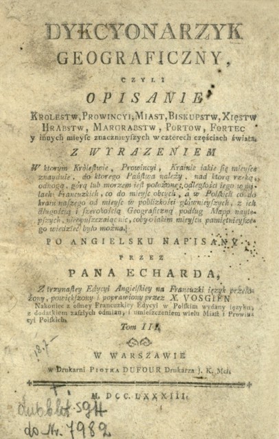 Dykcyonarzyk Geograficzny Czyli Opisanie Krolestw, Prowincyi, Miast, Biskupstw, Xięstw, Hrabstw, Margrabstw, Portow, Fortec y innych mieysc znacznieyszych w czterech częściach świata [...]. T. 3 / po angielsku napisany Przez Pana Echarda ; [tł. Fr. Siarczyński]. - Z trzynastey Edycyi Angielskiey na Francuzki ięzyk przełożony powiększony i poprawiony przez K. Vosgien, Nakoniec z osmey Francuzkiey Edycyi w Polskim wydany ięzyku, z dodatkiem zaszłych odmian i umieszczeniem wielu Miast i Prowincy Polskich. - W Warszawie : w Drukarni Piotra Dufour, 1783. - 218, 16, [4], [3 cz.], 67, [5] s., sygn. Aij-Pij, A-I ; 8˚.