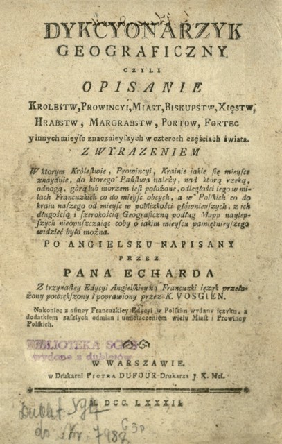 Dykcyonarzyk Geograficzny Czyli Opisanie Krolestw, Prowincyi, Miast, Biskupstw, Xięstw, Hrabstw, Margrabstw, Portow, Fortec y innych mieysc znacznieyszych w czterech częściach świata [...]. [T. 1] / po angielsku napisany Przez Pana Echarda ; [tł. Fr. Siarczyński]. - Z trzynastey Edycyi Angielskiey na Francuzki ięzyk przełożony powiększony i poprawiony przez K. Vosgien, Nakoniec z osmey Francuzkiey Edycyi w Polskim wydany ięzyku, z dodatkiem zaszłych odmian i umieszczeniem wielu Miast i Prowincy Polskich. - W Warszawie : w Drukarni Piotra Dufour, 1782. - [8], II, 315 s., sygn. A-Zij, Aa-Qq ; 8˚.