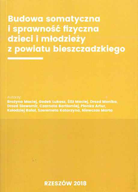 1. Cel pracy ; 2. Materiał i metody: 2.1. Opis badanej zbiorowości, 2.2. Metody oceny budowy somatycznej, sprawności fizycznej i sposobu odżywiania dzieci i młodzieży, 2.3. Zastosowane metody analizy statystycznej ; 3. Wyniki badań: 3.1. Ocena budowy somatycznej dzieci i młodzieży z powiatu bieszczadzkiego, 3.2. Ocena sprawności fizycznej dzieci i młodzieży z powiatu bieszczadzkiego, 3.3. Charakterystyka sposobu odżywiania dzieci i młodzieży z powiatu bieszczadzkiego, Wyniki badań ankietowych dotyczących nawyków żywieniowych w poszczególnych posiłkach dobowych: Śniadania, Obiady, Kolacje ; 4. Wnioski końcowe.