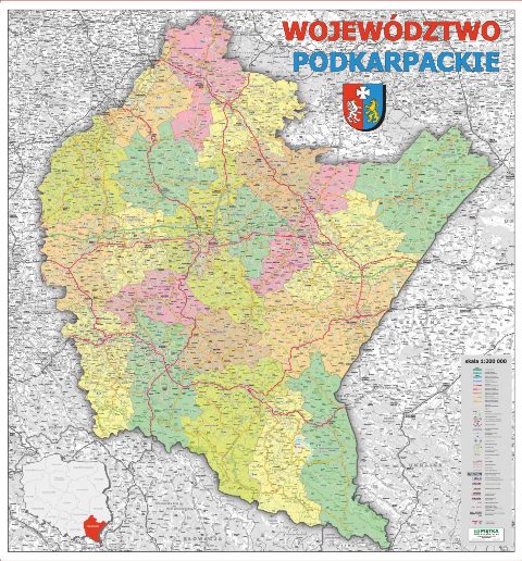 Województwo podkarpackie / Wydawnictwo Piętka. - Wydanie 2022. - [Katowice] : Wydawnictwo Piętka, 2022. - 1 mapa : wielobarwna, laminowana, na plastikowych wałkach ; 101x95 cm, arkusz 102x98 cm.