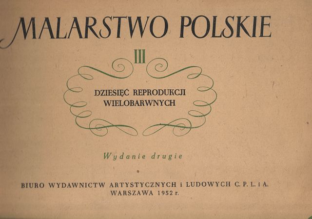 Malarstwo polskie : dziesięć reprodukcji wielobarwnych. III. - Wydanie drugie. - Warszawa : Biuro Wydawnictw Artystycznych i Ludowych C. P. L. i A., 1953. - Teka (10 kart reprodukcji) ; 30 cm + Dodatek drukowany: [4] strony.