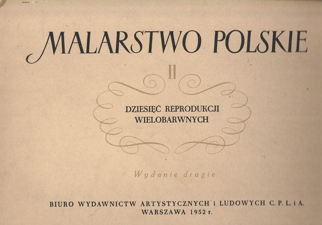 Malarstwo polskie : dziesięć reprodukcji wielobarwnych. II. - Wydanie drugie. - Warszawa : Biuro Wydawnictw Artystycznych i Ludowych C. P. L. i A., 1952. - Teka (10 kart reprodukcji) ; 30 cm + Dodatek drukowany: [4] strony.