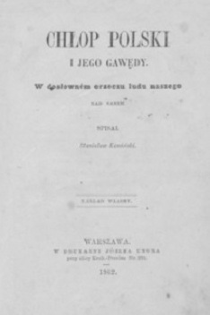 Chłop polski i jego gawędy : w dosłowném orzeczu ludu naszego nad Sanem / spisał Stanisław Kamiński. - Warszawa : nakład własny, 1862 (Warszawa : W Drukarni Józefa Ungra). - [4], V, [1], 212 stron ; 19 cm.