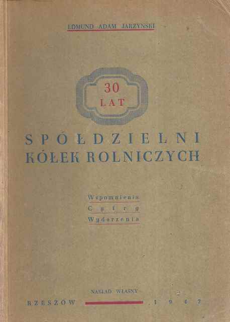 Trzydzieści lat Spółdzielni Kółek Rolniczych : wspomnienia, cyfry, wydarzenia / Edmund Adam Jarzyński. - Rzeszów : nakład własny, 1947. - 279 stron, [8] kart tablic : fotografie, ilustracje, mapy ; 20 cm.