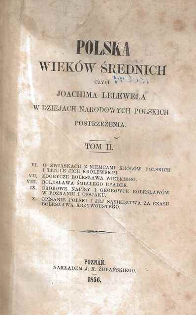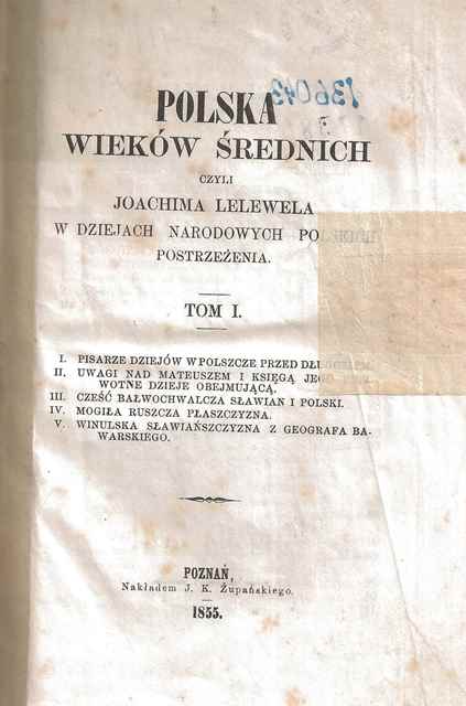 Polska wieków średnich czyli Joachima Lelewela w dziejach narodowych polskich postrzeżenia. T. 1 / Joachim Lelewel. - Poznań : nakładem J. K. Żupańskiego, 1855 (Poznań : L. Merzbach). - VIII, 504, [3] karty tablic złożone : ilustracje, faksymilia, mapa ; 21 cm.
