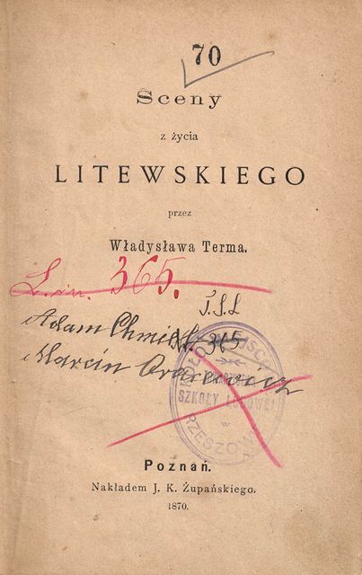 Sceny z życia litewskiego / przez Władysława Termę. - Poznań : nakładem J. K. Żupański, 1870 (Drezno : Druk J. I. Kraszewskiego). - [4], 162, [1] strona ; 18 cm.