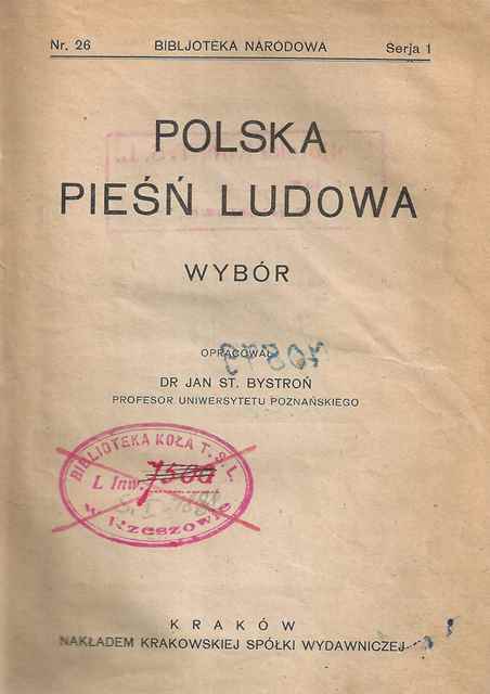 Polska pieśń ludowa : wybór / oprac. Jan St. Bystroń. - Wyd. 2 przejrz. - Kraków : Nakładem Krakowskiej Spółki Wydawniczej, [1925] (Kraków : W. L. Anczyc, 1925). - XLII, 119 s. ; 17 cm.