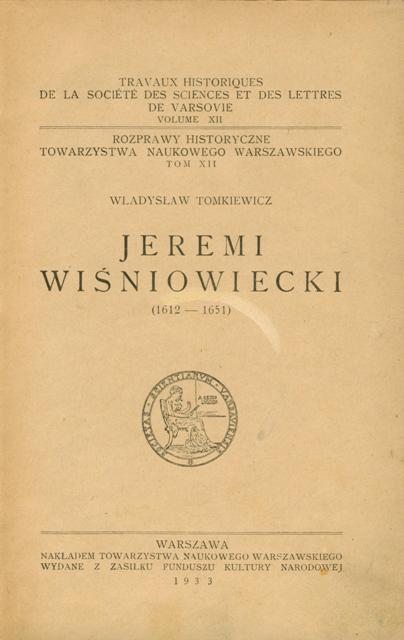 Jeremi Wiśniowiecki (1612-1651) / Władysław Tomkiewicz. - Warszawa : nakładem Towarzystwa Naukowego Warszawskiego, 1933 (Warszawa : Zakłady Graficzne E. i D-ra Koziańskich). - XVI, 406 stron, [1] karta, [3] karta tablic złożonych : mapy, portret ; 23 cm.
