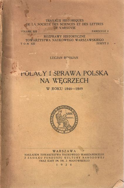 Polacy i sprawa polska na Węgrzech w roku 1848-1849 / Lucjan Russjan. - Warszawa : nakładem Towarzystwa Naukowego Warszawskiego, 1934 (Warszawa : Drukarnia Dziełowa). - [3], 302, [1] strona ; 24 cm.