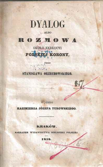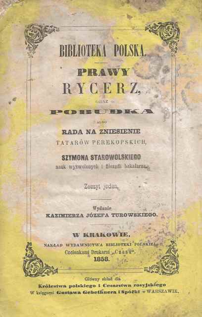 Prawy rycerz, oraz Pobudka albo Rada na zniesienie Tatarów perekopskich Szymona Starowolskiego - Wydanie Kazimierza Józefa Turowskiego. - Kraków : nakładem Wydawnictwa Biblioteki Polskiej, 1858 (Kraków : czcionkami Drukarni "Czasu"). - 42 ; 17, [1] strona ; 19 cm.
