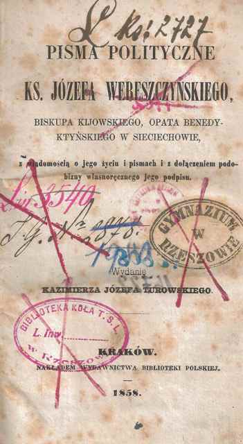 Oznaczenie numeracji serii i z. przejęto z Estr. XIX i monografii: Wydawnictwo Biblioteka Polska Kazimierza Józefa Turowskiego 1855-1863 / Roman Jaskuła. - Kraków, 1992.