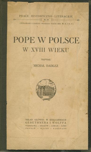 Pope w Polsce w XVIII wieku / napisał Michał Dadlez. - Warszawa [i inne] : Skł. gł. Księgarnie Gebethnera i Wolffa, 1923 (Kraków : Druk W. L. Anczyca i Spółki). - VI, 81 stron ; 23 cm.